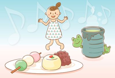 どれから食べようかな〜♪ まずは味のやさしい三色ダンゴから ☆